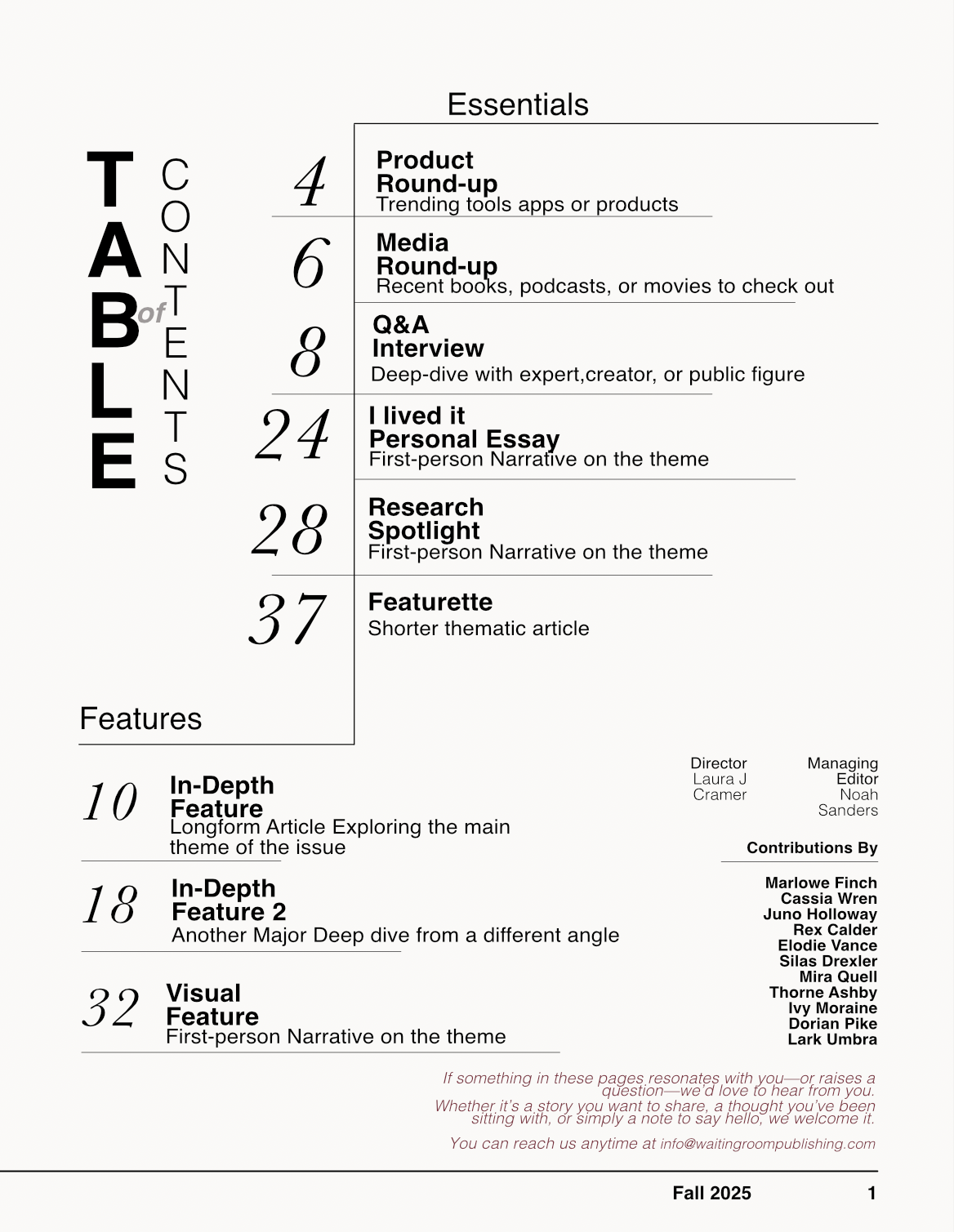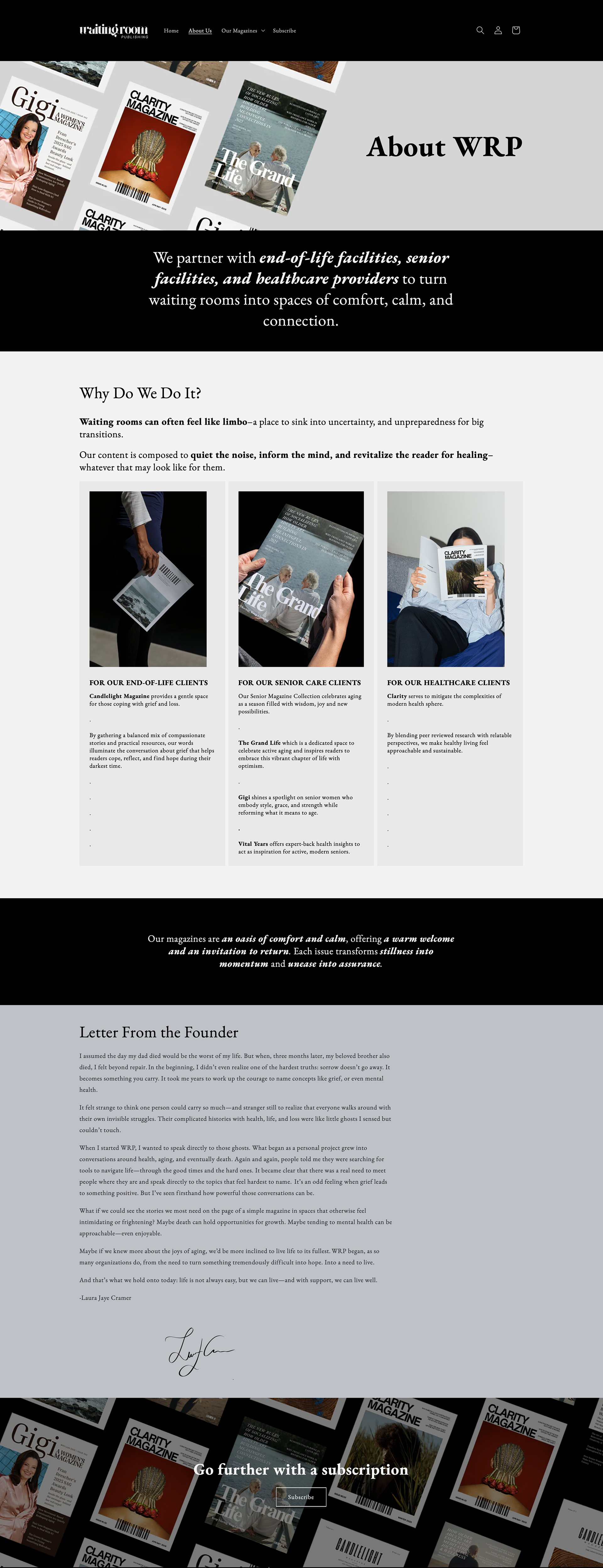 During my internship at Waiting Room Publishing, I worked on magazine layouts, website design, and marketing materials that strengthened the brand’s visual identity and digital presence.