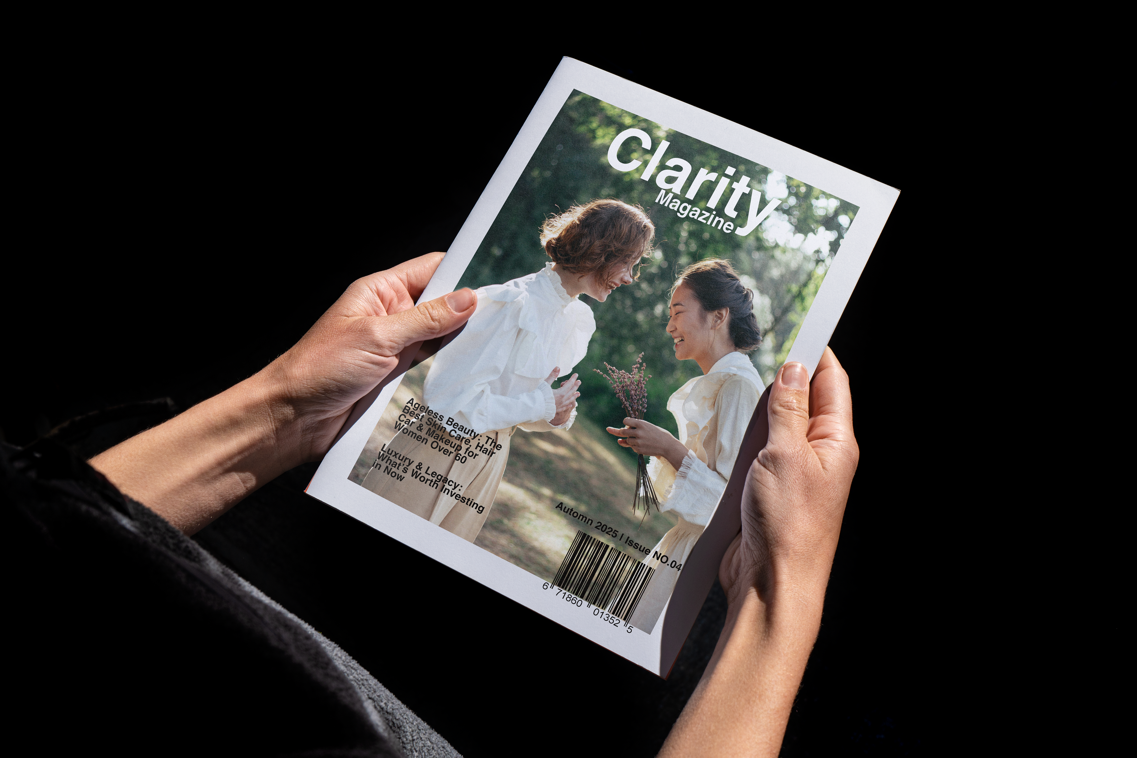 For Clarity Magazine, I designed the cover to reflect its identity: approachable, smart, and rooted in real-life experiences. The masthead "Clarity", set in a bold sans-serif, ensures strong brand recognition with a clean aesthetic. The main image—two women sharing a candid moment—captures the magazine’s mission of promoting wellness and connection without pretension. Supporting cover lines sit along the lower half, balancing space and readability while highlighting themes of beauty, legacy, and lifestyle. With the barcode and issue details anchoring the bottom, the design delivers a polished, professional look that mirrors Clarity’s voice: cool, welcoming, and sophisticated.